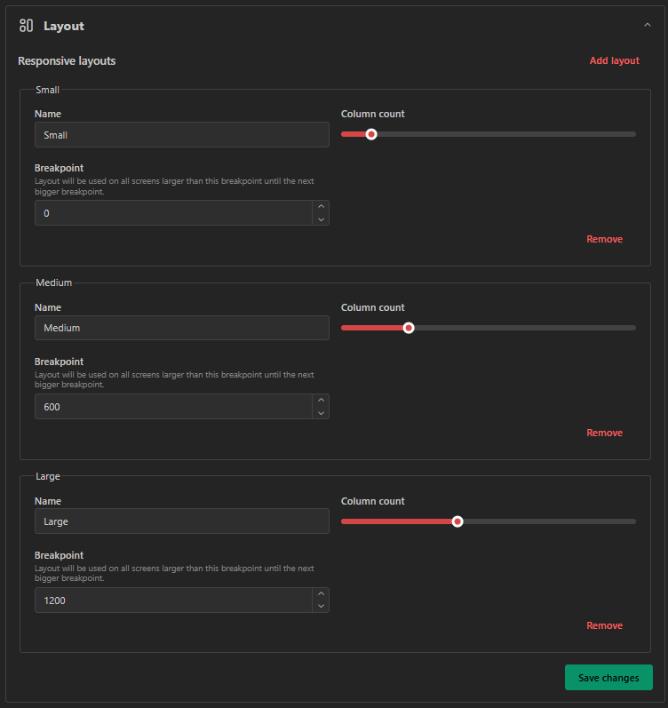 On each element the position and size of items can be changed seperately. When adding a new layout the position and sizes will automatically be generated depending on the column count. When adding a new item / dynamic section that will always be 1x1 on each layout and placed on the first available position.